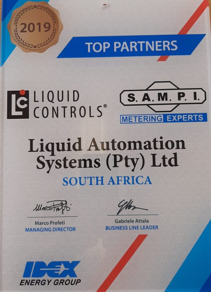 Marko Basson from IDEX Energy Group, presented Paul Bardon and Konrad Burger from LAS with a TOP PARTNER award from Liquid Controls for 2019. This award follows on from our award as a LC TOP DISTRIBUTOR in 2018. Congratulations to all LAS staff who contributed to this achievement.